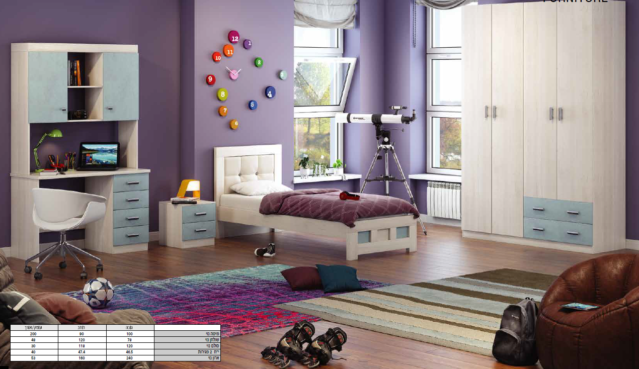 החדר כולל: מיטה, ארון, שידה, סולם נוי, שולחן כתיבה.
