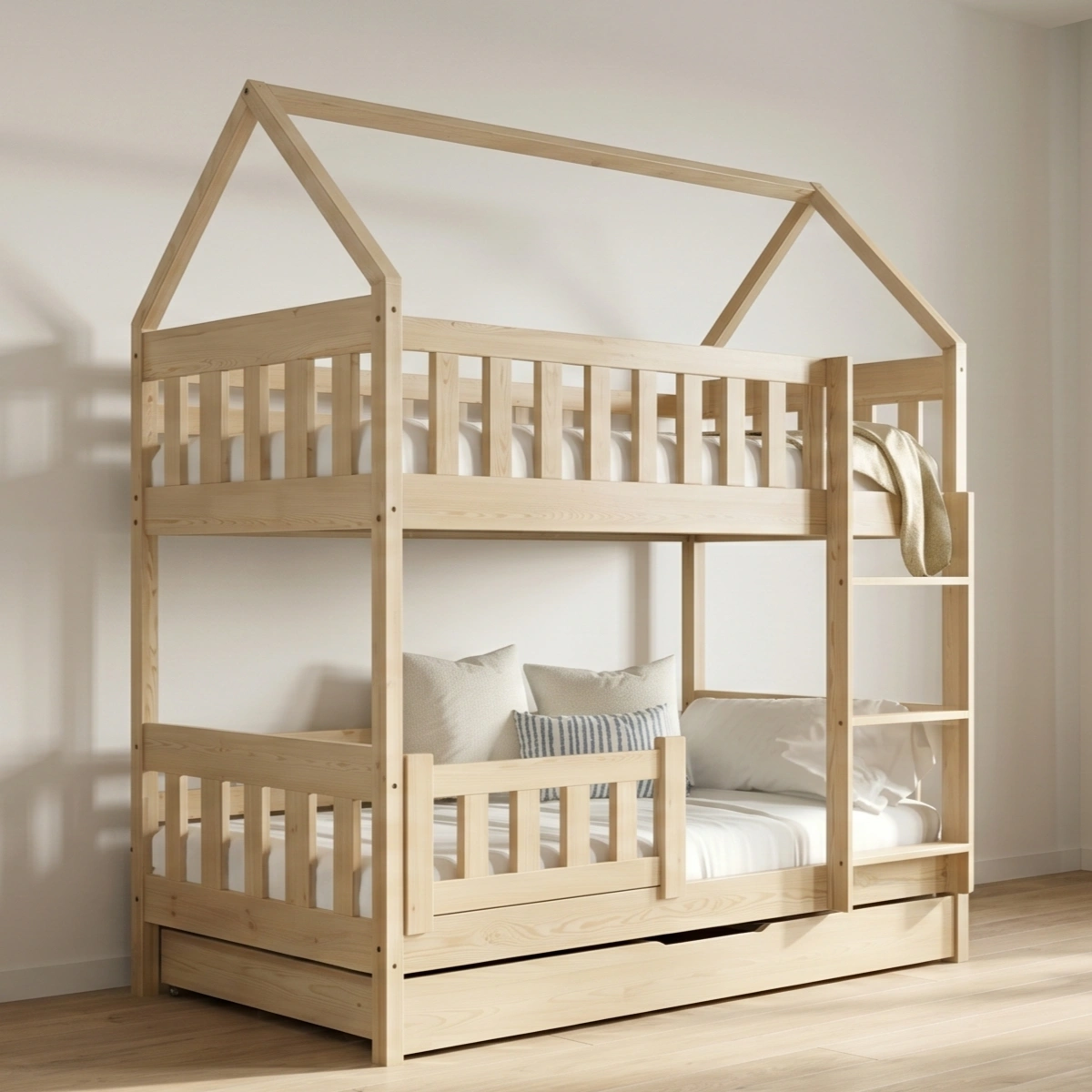 המיטה העליונה והתחתונה מגיעות עם מעקה בטיחות גבוה במיוחד להגנה ובטיחות מרבית של הילד.